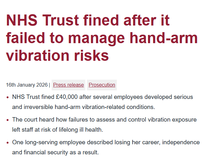 Chesterfield NHS Trust has been fined after several employees were diagnosed with Hand Arm Vibration Syndrome (HAVS) and Carpal Tunnel Syndrome (CTS) after exposure to vibration from their work equipment....